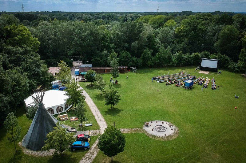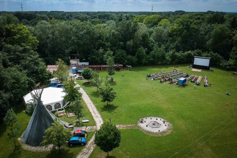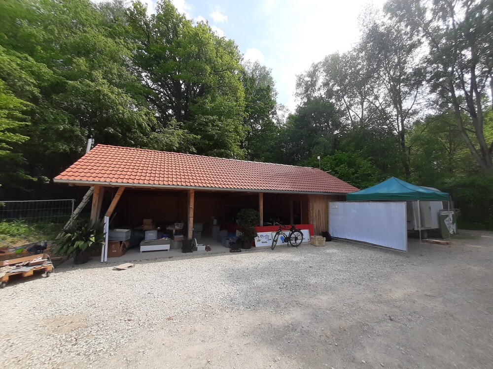 Von April bis Oktober vermieten wir auf 10.000qm Grundfläche ein Pagodenzelt für 180 Personen und eine Massivholzhütte mit Feldküche inkl. 10 Biertischgarnituren. Auf dem Platz findet ihr Sanitäranlagen, eine große Lagerfeuerstelle mit Grillplatz, ein Versammlungs-Tippi aus Holz und eine Tischtennisplatte. Außerdem habt ihr einen direkten Zugang zum Baggersee Ingolstadt!