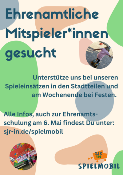 Um gut auf die Spielsaison vorbereitet zu sein findet am 6. Mai von 10.00 - 18.00 eine Ehrenamtsschulung statt! An diesem Tag könnt ihr die Arbeitsweise des Spielmobils kennenlernen und die Saison mitgestalten - was wird gebastelt, welche Spiele werden wir spielen? Für die Verpflegung während dieses Tages wird gesorgt.