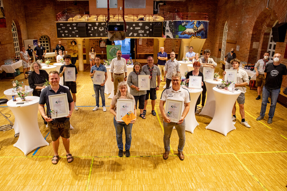 Hinter den drei Preisträger:innen der Kath. Jugend Zuchering, JBRK Heidi Essenbach und FC Gerolfing formierten sich bei der Verleihung des 1. Jugendarbeitspreises in der Fronte79 alle ausgezeichneten Gruppen und Einzelpersonen. Weitere Preisträger siehe unten. Foto: Johannes Hauser